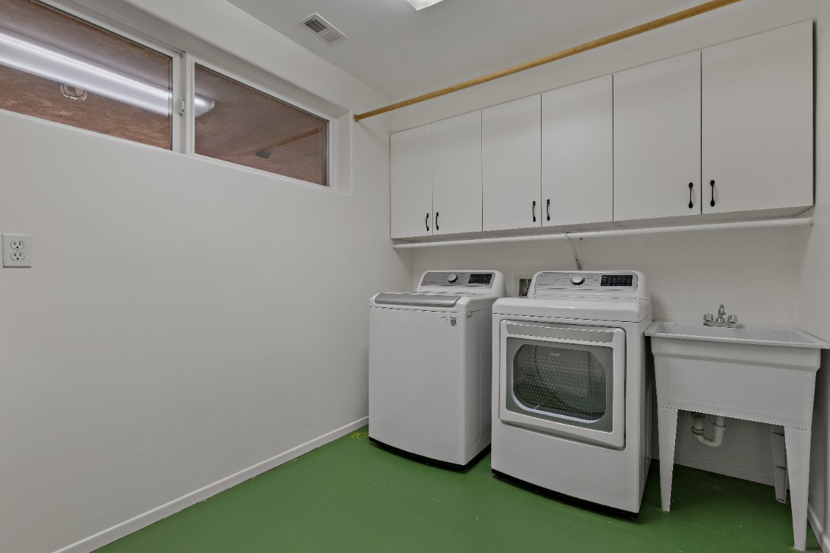 LARGE, FENCED BACKYARD with raised entertainment area and tons of potential for an avid gardener! DOUBLE CAR GARAGE with ample custom built in wall and ceiling storage - great for surf boards! Dumb waiter to conveniently take groceries up to the kitchen. Ample storage includes a separate storage room under the interior stairwell. Large laundry room with full-size washer/dryer and tons of storage cabinets.