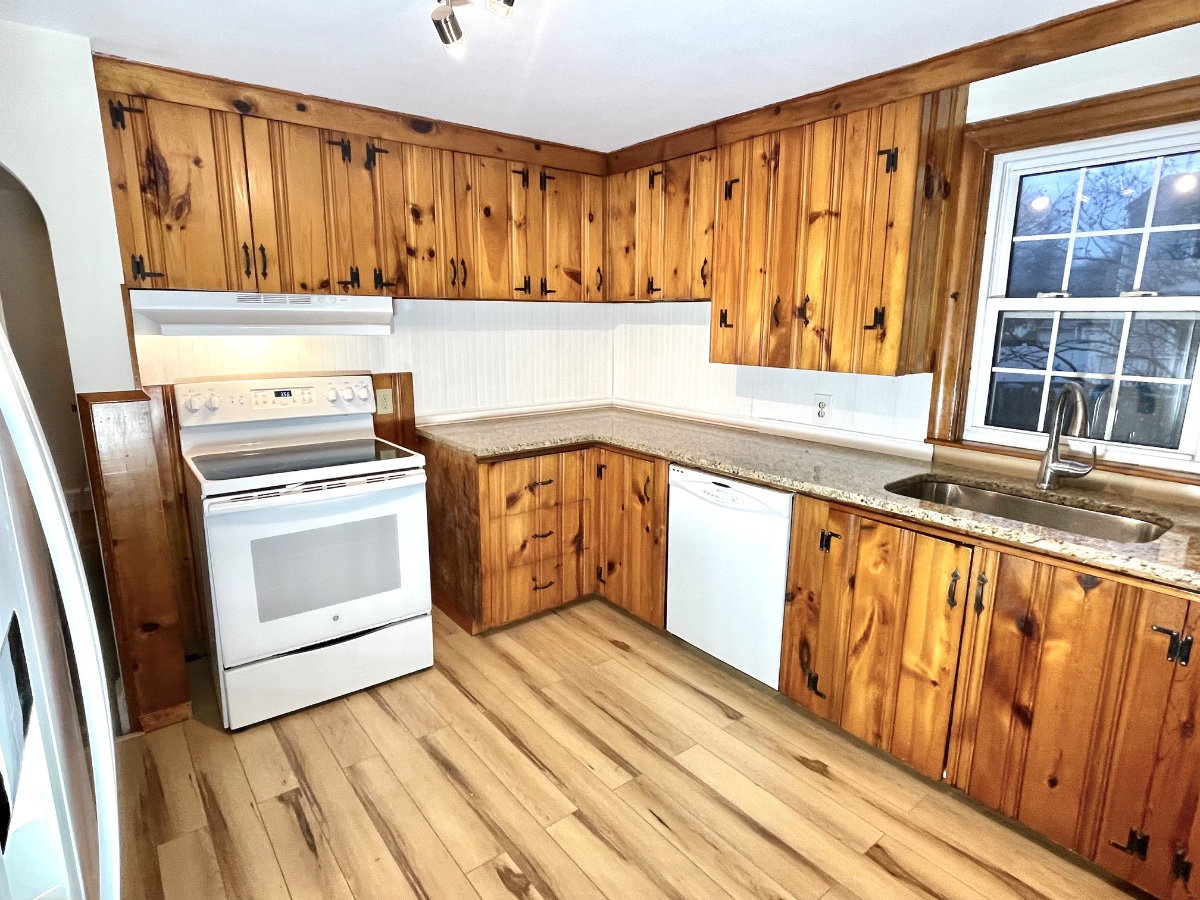 Enter through the Breezeway door and find a Kitchen outfitted with new granite countertops, pristine appliances including refrigerator with water and ice maker, and a big, single-tub stainless steel sink with new sprayer faucet all complementing the abundant, meticulously maintained knotty pine cabinets and built-in floor-to-ceiling double door pantry. The new wainscoting backsplash ties it all together.
