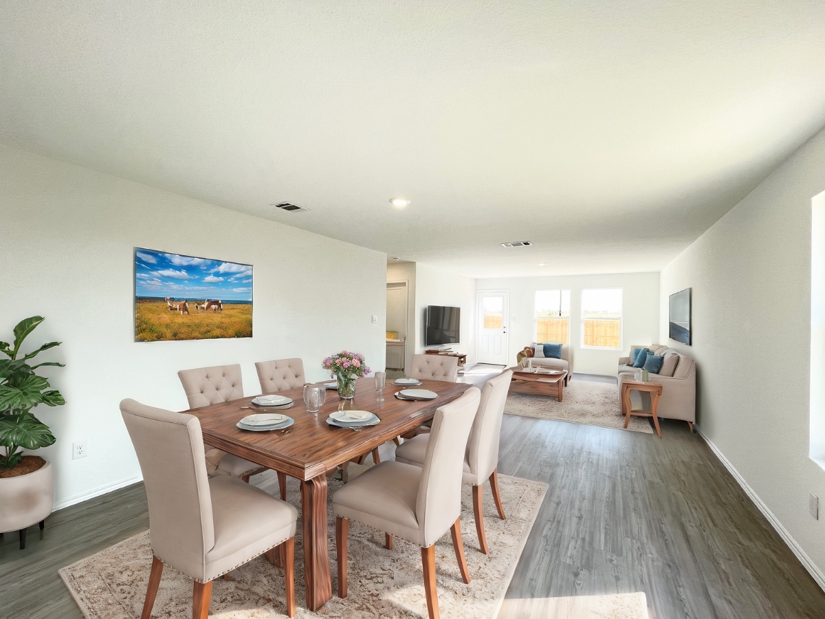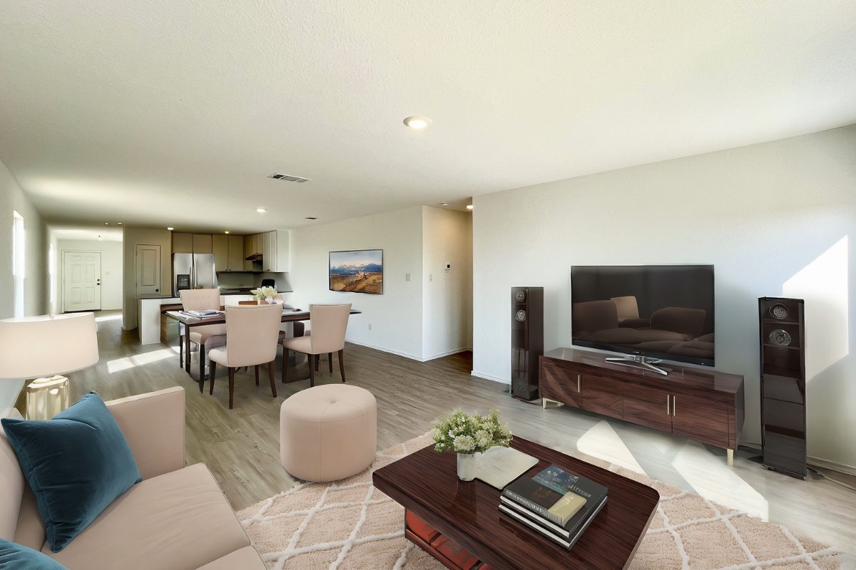 Discover this beautifully designed rental property featuring an open floor plan that seamlessly connects the living and dining areas. The spacious kitchen boasts solid countertops, a gas stove/range, dishwasher, and a convenient breakfast bar, perfect for casual dining or entertaining.