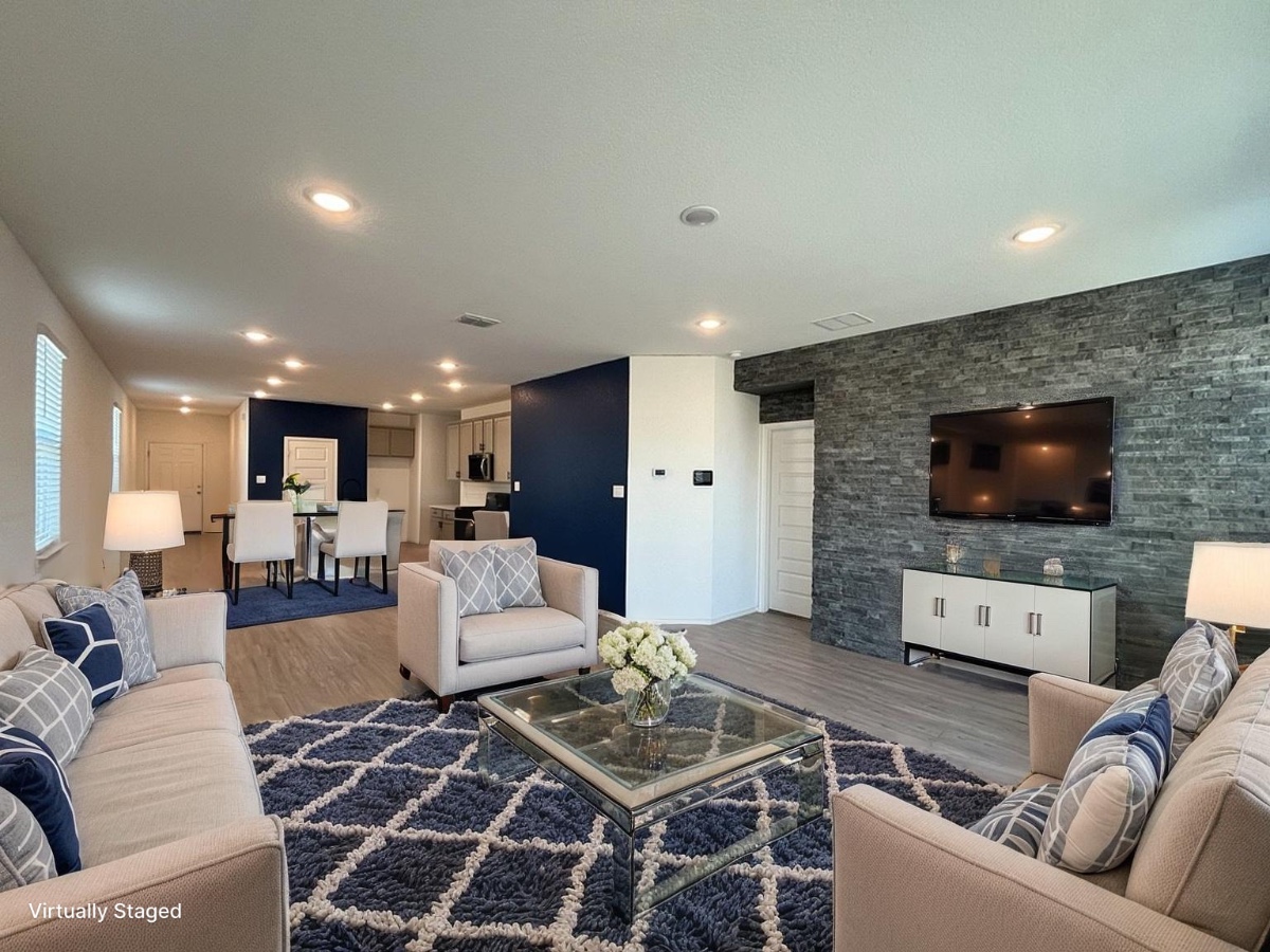 The kitchen is both functional and welcoming, offering a gas stove, dishwasher, microwave, pantry, and a convenient breakfast bar/island, ideal for casual meals or entertaining. A dedicated laundry room includes washer and dryer hookups for added convenience.