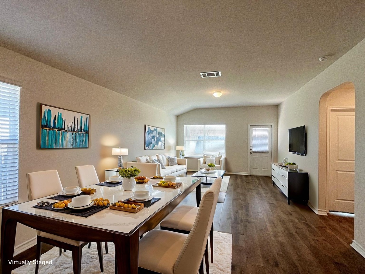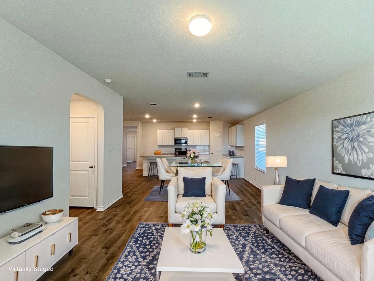 Welcome to this inviting 4-bedroom, 2-bath home that blends comfort, style, and everyday convenience in a desirable greenbelt setting. Inside, you’ll find a bright open floor plan with high ceilings and a spacious living/dining room combo, complemented by a mix of carpet, ceramic tile, and vinyl flooring. Modern comforts include an alarm system, carbon monoxide detector, HVAC with a programmable thermostat, and plumbing ready for a water softener.