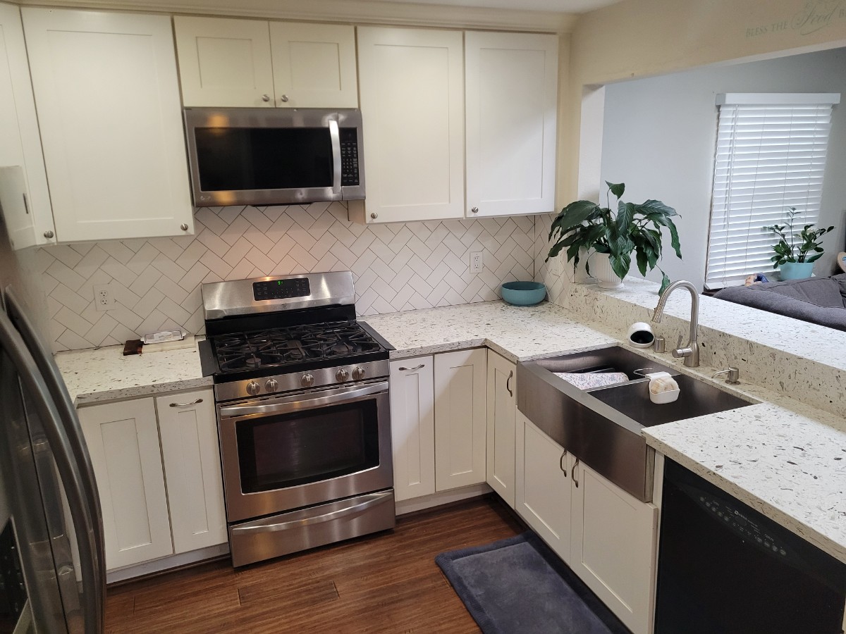 Chef-Inspired Kitchen: White shaker cabinets, custom granite countertops with waterfall edge, stainless steel appliances, a gas stove, and herringbone subway tile backsplash. The eat-in buffet bar with seating for four is perfect for family meals or quick bites before duty.