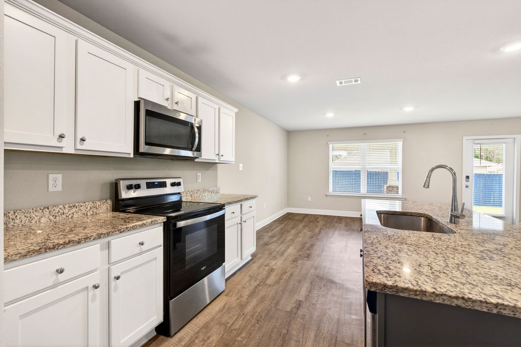 The kitchen includes granite countertops, stainless steel appliances, and plenty of cabinet space, opening seamlessly into the living and dining areas. The home also features Mohawk luxury vinyl plank flooring throughout the main areas and modern finishes including gray-toned countertops and dark flooring.