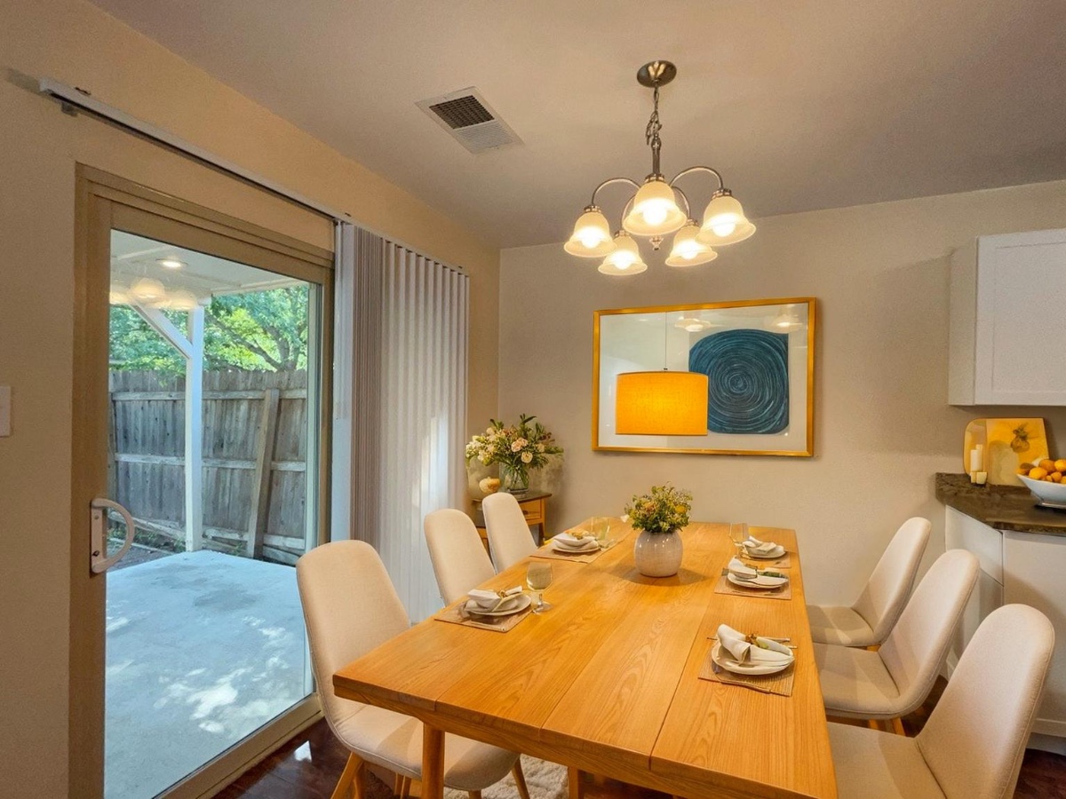 The kitchen is fully equipped with an electric stove, microwave, dishwasher, refrigerator and an eat-in dining area. Conveniently located within the kitchen, the laundry room comes with a washer and dryer, making everyday tasks simple and efficient.