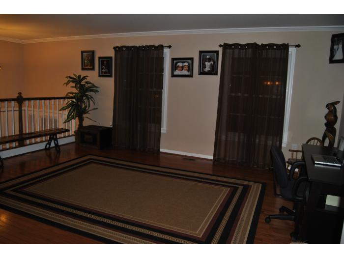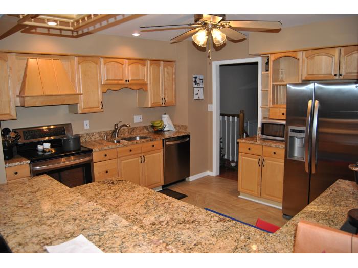 Large family room w/hi ceilings off remodeled kitchen with stainless steel appliances, granite counter tops and up-graded maple cabinets with great storage.