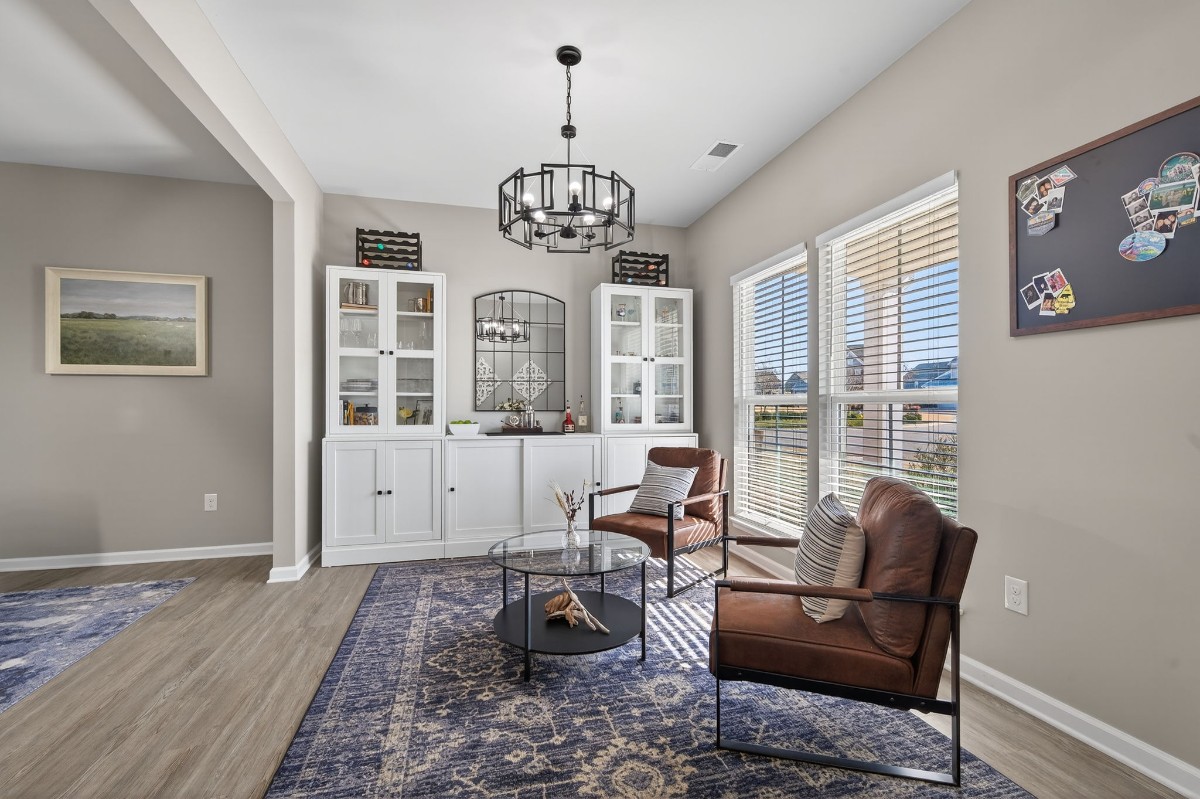 Inside, the bright, open main level features multiple living areas designed for both everyday living and entertaining. The kitchen flows seamlessly into the main living space, while the additional morning room—currently used as a playroom—offers flexible use. A formal living room with custom built-ins is styled as a bar area, creating a perfect setting for hosting. The study includes a Murphy bed, providing a smart and comfortable guest-space option.