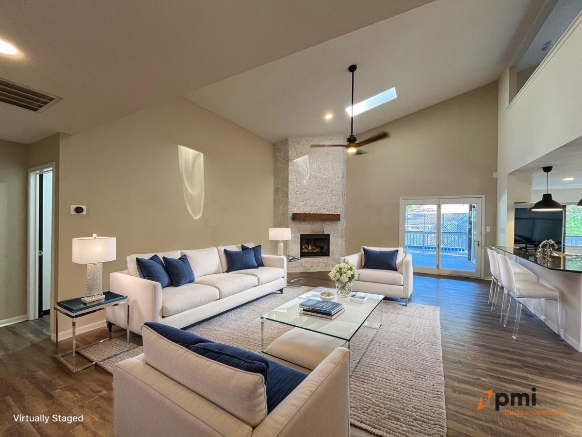 Inside, you'll find high ceilings, skylights and an open floor plan that fills the home with natural light. The two fireplaces create cozy gathering spots, while vinyl and wood flooring throughout add warmth and easy maintenance. The loft area offers a versatile bonus space to fit your lifestyle.