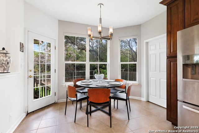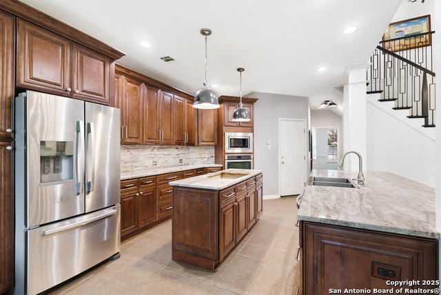 Beautifully remodeled two-story home in the sought-after Rogers Ranch subdivision. This home welcomes you with soaring ceilings, elegant vinyl flooring, and tasteful upgrades throughout. Off the entry, a formal dining room with an eye-catching chandelier sets the tone for gatherings, while a private office provides a quiet space to work from home. The living room is warm and inviting with arched windows that flood the space with natural light, a stunning oversized light fixture, a gas fireplace, and a striking view of the grand staircase. The kitchen impresses with marble countertops, custom cabinetry, a large island, and stainless-steel appliances, including a refrigerator.