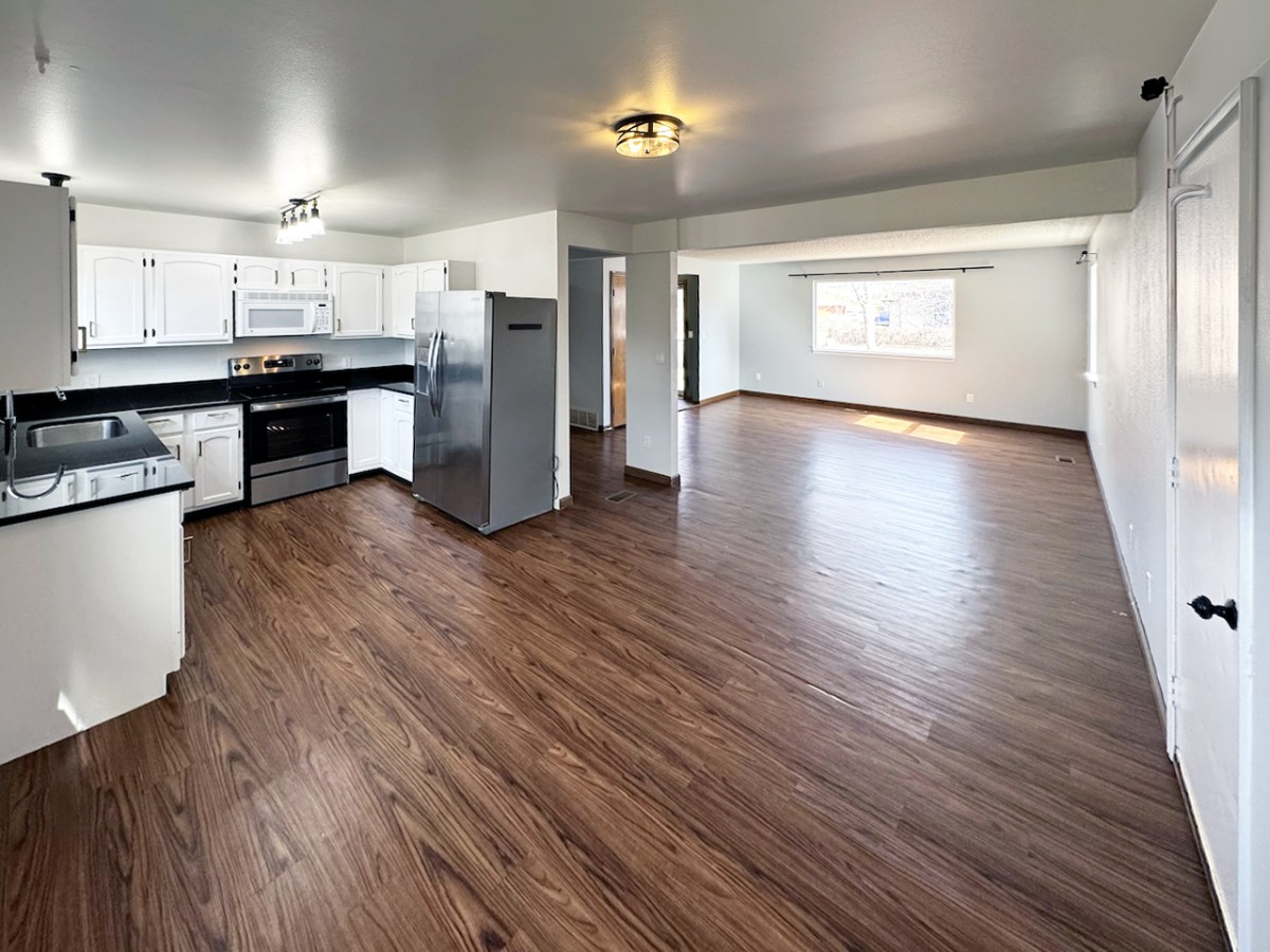 Step into a bright living and dining area that flows seamlessly into a fully equipped kitchen featuring a stove, refrigerator, dishwasher, and microwave. A convenient doggy door leads to a fenced backyard, providing easy outdoor access.
