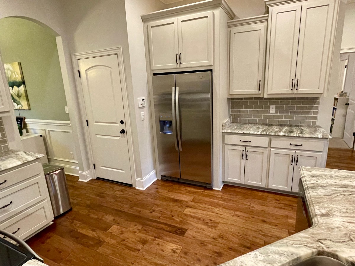 Inside, the home welcomes you with durable LVP flooring throughout the main living areas and a spacious living room accented by a tray coffered ceiling and ceiling fan, creating an inviting space for everyday living or entertaining. The open layout flows seamlessly into the kitchen and dining areas, making the home feel bright and connected. The kitchen is thoughtfully designed with modern white cabinetry, granite countertops, a tile backsplash, stainless steel appliances, and abundant cabinet and counter space. A large peninsula with bar-top seating offers additional functionality, while a pantry and recessed can lighting add convenience and style. The kitchen opens to both a breakfast nook and a formal dining area, providing flexible options for meals and gatherings.