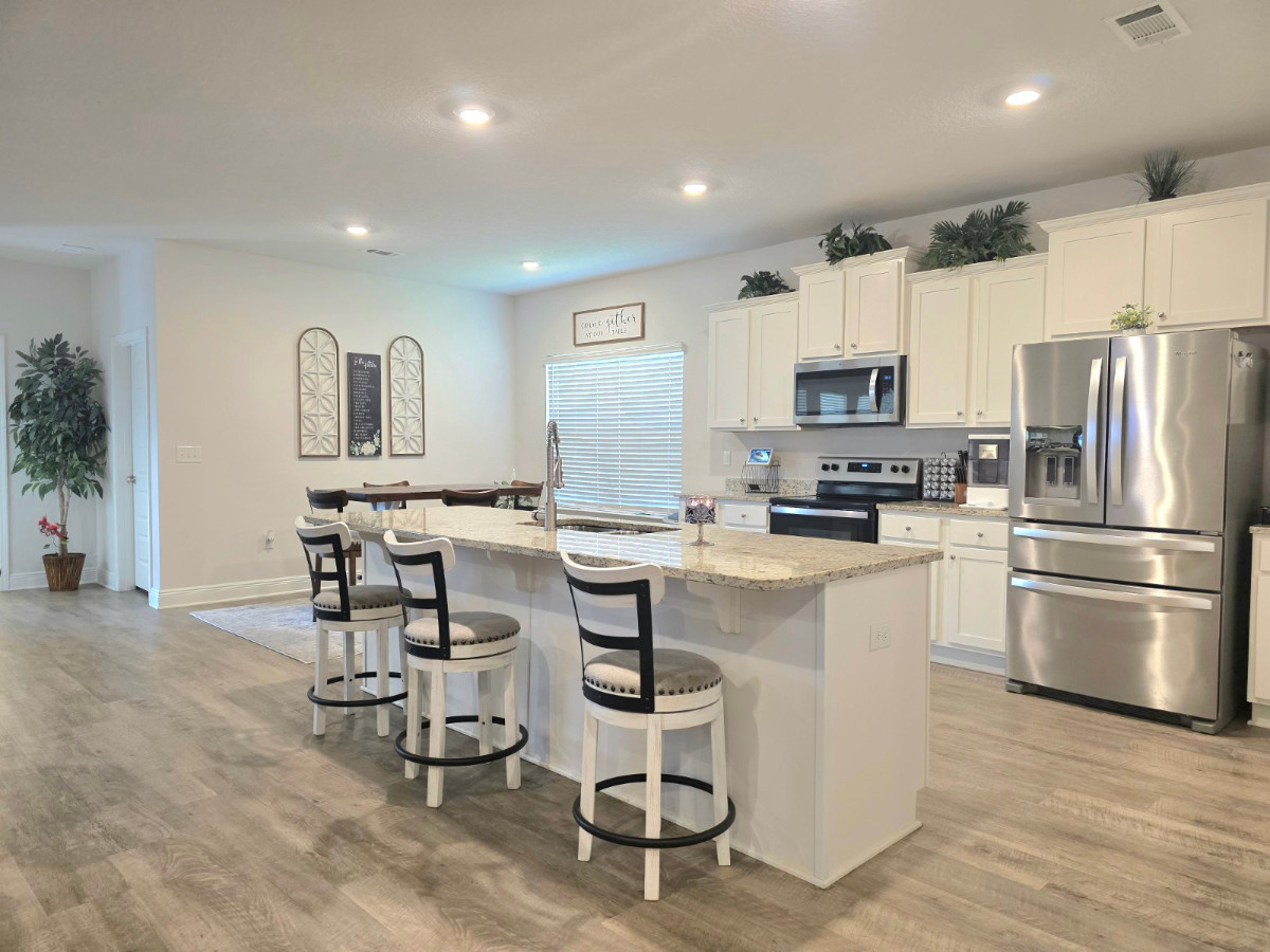 This spacious 4-bedroom, 3-bath home boasts an open-concept design that flows seamlessly from room to room—perfect for relaxing nights in or entertaining friends and family. You’ll love the luxury vinyl plank flooring throughout the main areas, plush carpet in the bedrooms, and a bright, airy great room with a tray ceiling and recessed lighting. The gourmet kitchen steals the show with its granite countertops, stainless steel appliances, walk-in pantry, and oversized island that’s perfect for gathering around. Enjoy your morning coffee in the cozy breakfast nook or take dinner to the elegant dining area nearby. The double split-bedroom layout gives everyone space and privacy. Retreat to your primary suite oasis featuring a tray ceiling, soaking tub, separate walk-in shower, dual vanities, granite counters, and a huge walk-in closet. The additional bedrooms are spacious with plenty of storage and access to two full guest baths—each with beautiful granite finishes. Step outside to a fully fenced backyard with a covered patio, ideal for cookouts, playing with pets, or unwinding under the stars. With a 3-car garage, convenient laundry room, and location near downtown Milton and NAS Whiting Field, this home checks every box for style, comfort, and location. Pets by owner approval. $75 App fee per adult, half off for military. Subject to credit check, background check, employment verification, and rental verification. CERTIFIED Funds required for move in!
