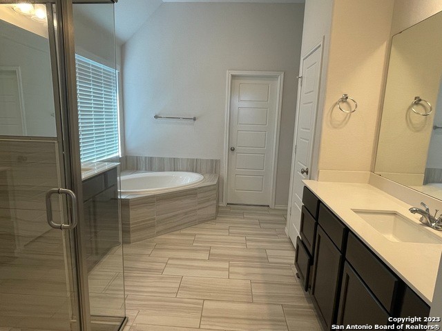 Located in the Kallison Ranch subdivision, this 4-bedroom, 3-bath home offers a spacious layout with high ceilings and abundant natural light throughout. The floor plan includes a dedicated office space suited for working from home or study. The kitchen features white cabinetry, stainless steel appliances including a dishwasher, and a large eat-in island that opens to the main living area. The primary suite continues the high ceilings and includes a walk-in closet and a private bath with a garden tub and separate stand-up shower. Secondary bedrooms provide flexibility for family or guests. The backyard is fully fenced with a privacy fence and covered patio, offering space for outdoor use. Community amenities include a playground and swimming pool. Conveniently located near SeaWorld, Alamo Ranch shopping, theaters, and dining. Make-ready items to be completed.