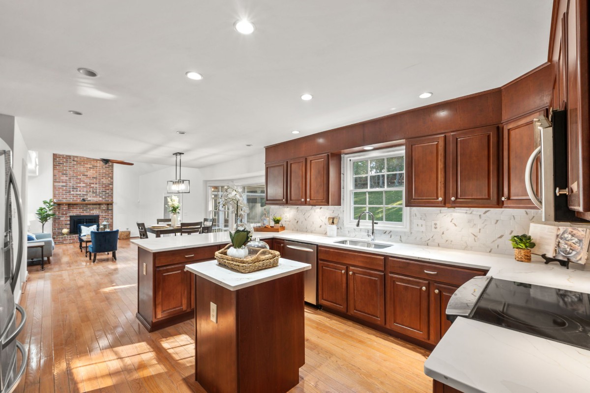 Inside, enjoy an updated gourmet kitchen with quartz counters and stainless steel appliances, formal living and dining rooms, a family room, and a private office. The kitchen opens to a covered rear patio surrounded by mature trees, creating a private outdoor oasis.