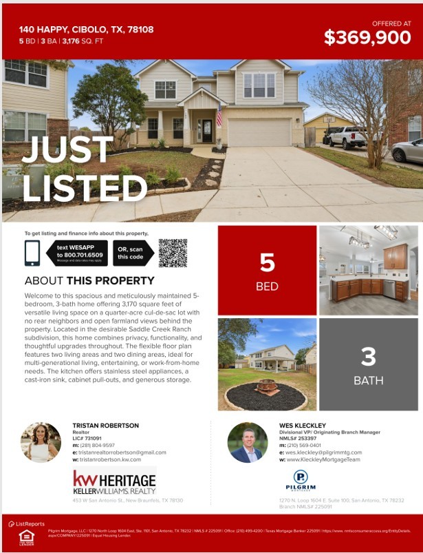VA Assumable 2.25% • 5BR/3BA • Minutes to Randolph & Ft Sam • Cul-de-Sac Lot