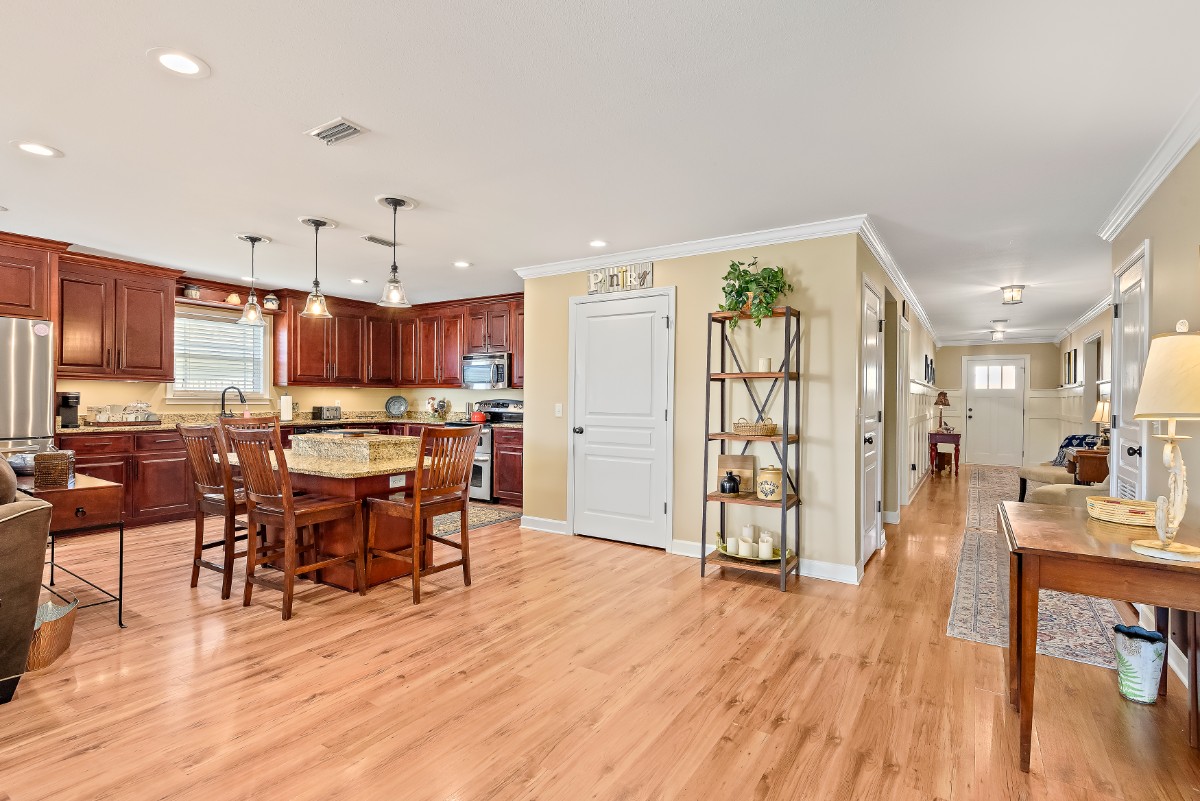 Step into a thoughtfully designed interior featuring updated furnishings. The open floor plan includes a large living area, formal dining space, and a well-equipped kitchen with a refrigerator, stove, microwave, dishwasher, garbage disposal, and island. This home also features a large laundry room with washer/dryer (provided but not maintained).