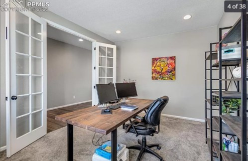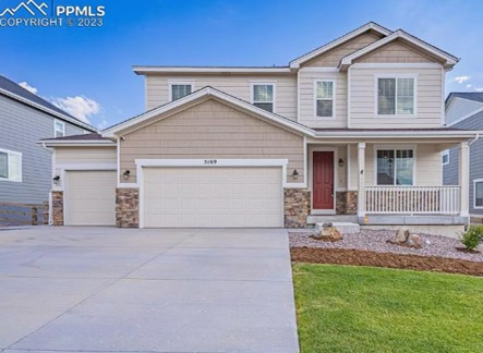 Like-new home in highly sought-after Academy School District 20 with 5 BR, dedicated office with French doors, massive MBR closet, walk-in pantry, great room living space on the main floor, huge open finished basement and unhindered view of Pikes Peak, Garden of the Gods and the entire front range south of them. Located in Bradley Ranch, this home features a large, carpeted office/flex space just inside the front door. Continue down the wide hall to find the open space containing the kitchen, dining room and carpeted living room. The massive kitchen island of gold accented quartz with bar seating for 6+ gives plenty of room for guests and dark tone LVP flooring immediately gives you a cozy feel. The kitchen also features all stainless steel appliances, a gas cooktop, tons of storage in cabinets and drawers, a walk-in pantry and coat closet. The connection between the family room, kitchen, sunroom/dining room and deck just screams entertainment! Almost 1500sq ft of living space is on this main level. Continue out through the sliding glass doors to the covered, second story, wooden deck for amazing views with ample room for table, chairs, grill and more for frequent outside dining and relaxing. Outside stairs lead down to the lawn and concrete pad perfect for a basketball hoop or trampoline.