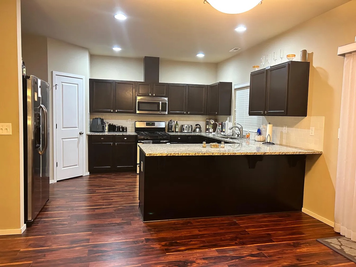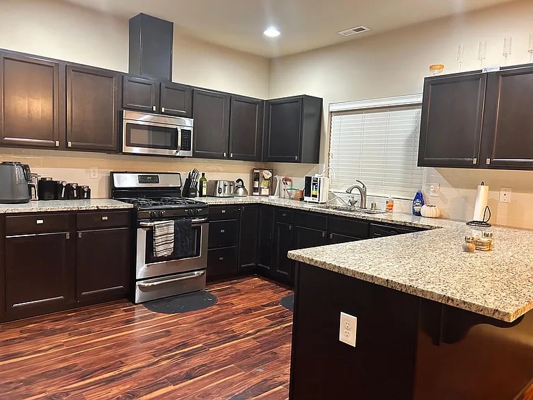 The kitchen is beautifully appointed with stainless steel appliances, granite countertops, a tile backsplash, and an eat-in island adding a touch of luxury. There's also a dedicated dining area for shared meals.