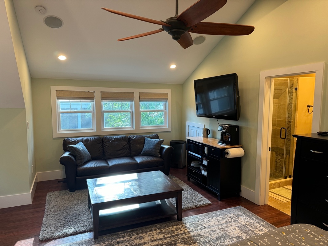 The spacious 550-square-foot studio sits above a detached garage and features a private entrance, high ceilings, large windows, modern finishes, and lots of storage space. It comes fully furnished with a high-quality queen bed, sleeper sofa, dining set, smart TV, and built-in Bluetooth surround speakers. The unit includes a washer and dryer, abundant street parking, and all utilities—electricity, gas, water, sewer, trash, and high-speed Wi-Fi—are included in the rent for a simple, all-inclusive rate.