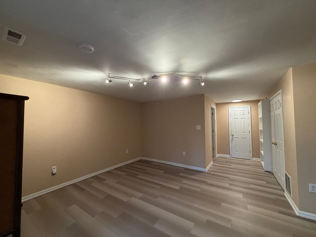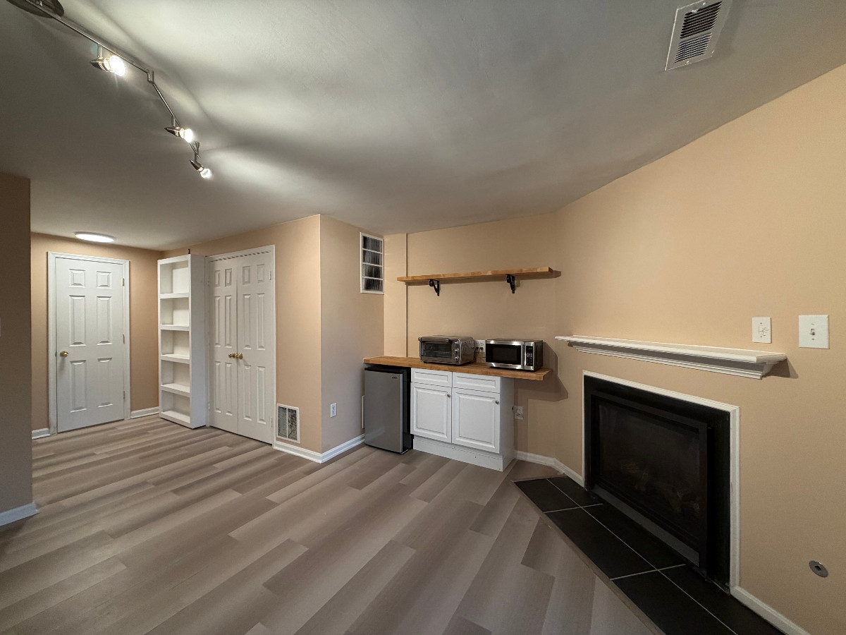 The updated basement studio with luxury vinyl plank floors, beautiful lighting, decorative fireplace, large full bath. Built in countertop and cabinets. Built in bookshelf. Extra room by stairs for storage. Separate laundry room with deep sink and shelving. One assigned parking space. Quiet neighborhood. No thru traffic. Backs to wooded area. Beautiful South Kings Station offers easy access to Huntington Metro, bus, Route 1, Old Town Alexandria, various military bases. Pets on a case by case basis 30 lbs, $50 monthly pet rent and $500 pet deposit. No Tenant access to upper two floors of this home or the upper deck, No smoking. $1,250 a month plus $100 contribution toward utilities.